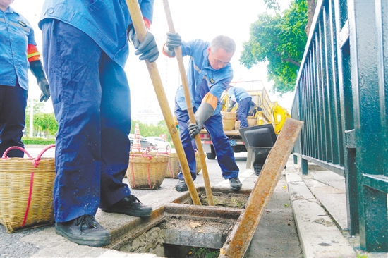 城管部门组织人员对辖区主干道的雨水口、雨水检查井进行重点清淤。