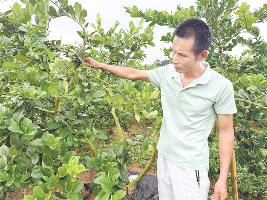 梁飞龙在香水柠檬种植园里检查果树的生长情况。