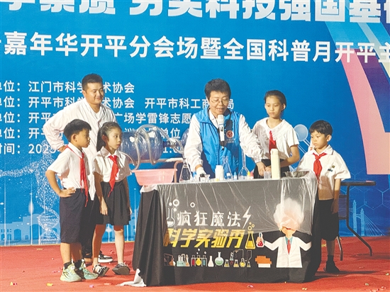 开平市消防救援大队消防员身着各类救援服装登台,详细介绍不同服装的功能与适用场景;荣获今年广东省青少年机器人大赛一等奖的开平市风采实验学校学生为市民讲解和演示绘画机器人,展现开平科创教育成果;在精彩的“大象牙膏”“脉冲等离子炮”科普秀中,表演者一边操作一边讲解原理,并邀请观众上台参与,沉浸式感受科学乐趣……活动启动仪式上,精彩节目接连登场,赢得现场观众的阵阵掌声。