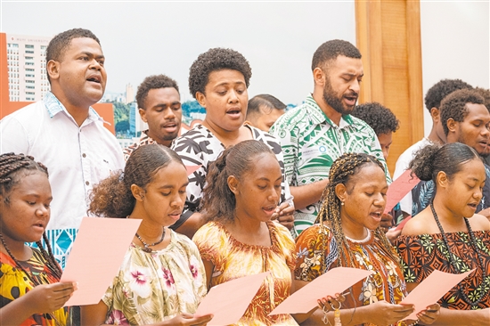 留学生合唱斐济歌曲《我的布卡湾之旅》,展示太平洋岛国特色文化(第二排左一为塞米,右一为萨姆)。