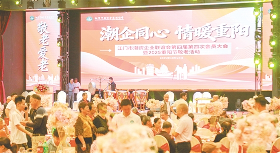 江门日报讯 (文/图 记者/陈倩婷) 10月28日,江门市潮资企业联谊会举办以“潮企同心 情暖重阳”为主题的第四届第四次会员大会暨2025年重阳节敬老活动。