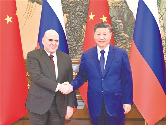 米舒斯京转达普京总统对习近平主席的亲切问候和良好祝愿。米舒斯京表示,祝贺中共二十届四中全会成功举行,相信中国一定会顺利实现“十五五”规划建议确定的目标,取得更大经济社会发展成就。两国元首今年两次会晤,对俄中关系发展作出战略规划,巩固了俄中全面战略协作伙伴关系。俄方愿同中方一道,落实两国元首达成的重要共识,深化经贸、科技、能源、农业、数字经济等领域合作,密切人文交流,加强多边协调配合,推动两国合作取得更多成果。
