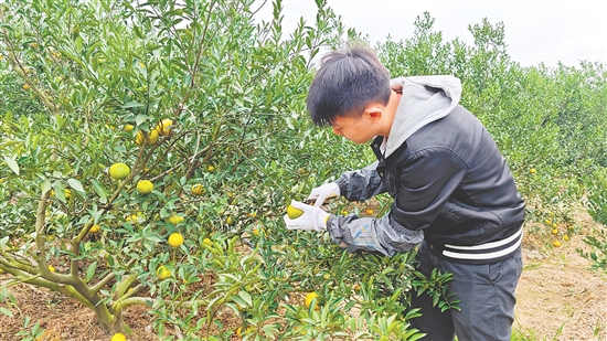 新会迈入二红柑采摘季,柑果皮色转黄。
