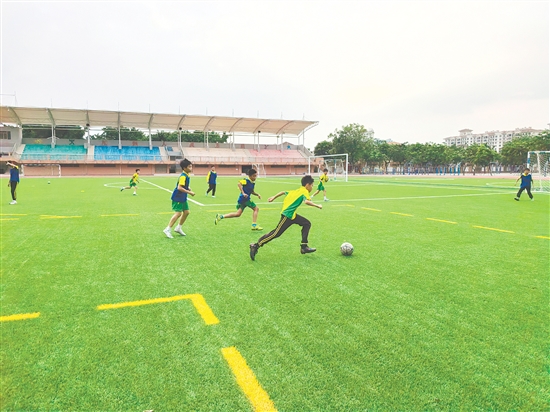 大课间时间,同学们在全新升级的体育场上踢足球。