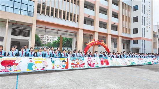 同是五(1)班学生的陈诗颖分享道:“我知道十五运会排球(男子成年组)项目将在台山举行,台山是‘排球之乡’,作为台山学子,我特别骄傲!今天我和同学们一起在长卷上画画,用这种方式为运动员加油,我觉得特别有意义!”