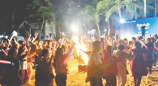 游客在王府洲沙滩上的篝火晚会尽情玩耍。