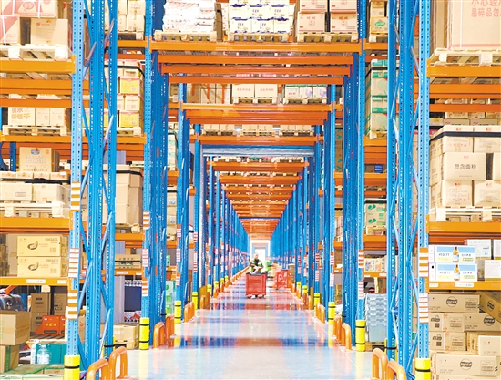 11月11日,在河南省南阳市万德隆大型综合产业园物流配送中心,工人在仓库运送商品。新华社发