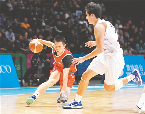 11月18日,广东队球员何文炜(左)在比赛中突破山东队球员姚柯宇的防守。新华社发