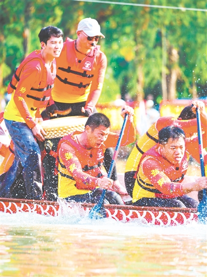 当天下午1时许,比赛正式拉开帷幕。首先进行的是22人国际龙舟赛,礼联东方龙舟队、乐途龙舟队、二圣宫龙舟队、大板桥龙舟队等10支队伍分成两组在碧波荡漾的河道上展开激烈角逐。