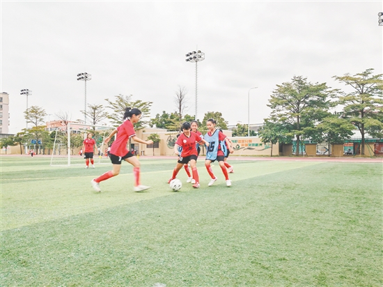 新会东区学校女足队员们在操场上尽情奔跑、拼抢。