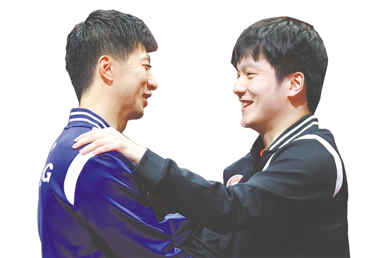 11月20日,北京队选手马龙(左)和上海队选手樊振东在赛后拥抱致意。新华社发