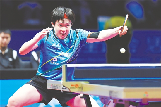 11月20日,北京队选手王楚钦在男单比赛中回球。他3比0战胜上海队选手许昕。新华社发