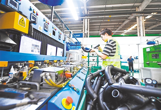 工作人员在位于天津滨海新区中塘镇的天津鹏翎集团股份有限公司生产车间检查汽车胶管产品。新华社发