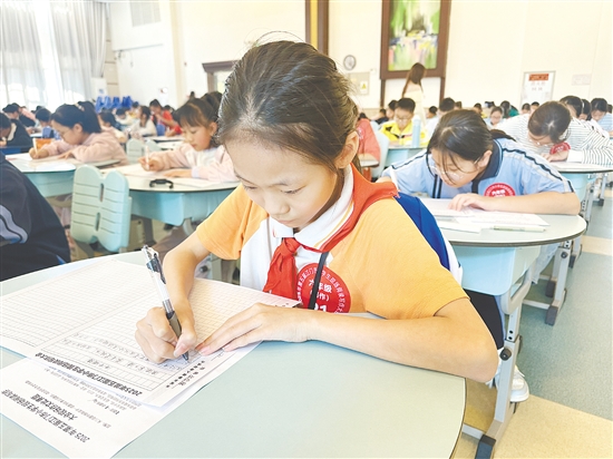 江门日报讯 (文/图 记者/张翠玲) “今天抽到的题目是……”随着抽题嘉宾从三个装有写作题目的信封中随机抽取一个,并揭晓宣读,比赛正式开始!11月23日下午,2025年江门市小学生现场阅读写作大会综合赛区在穗华实验学校举行,来自市直学校以及江门日报青苹果小记者的113名读写高手在这场阅读写作的盛宴中展现自己的才华。最后,20名选手脱颖而出,晋级全市总决赛。自此,本届比赛8个初赛赛区的比拼全部结束,晋级12月全市总决赛的167名写作选手和164名阅读选手全部产生。