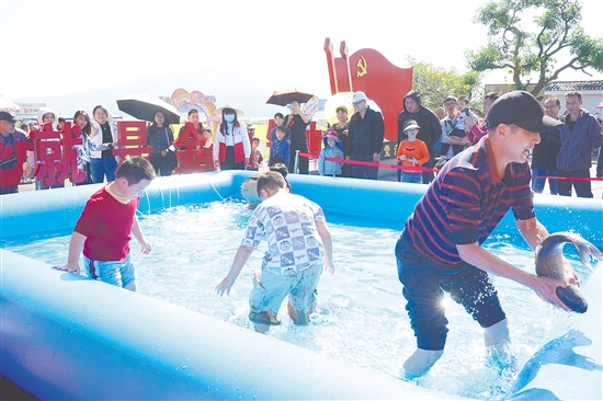 此外,鱼王竞猜、开平优品市集展销、趣味捉鱼等互动项目也吸引了大量游客参与。依托线上公众号发起的鱼王竞猜结果揭晓,一条重达16.55公斤的“鱼王”成为焦点。优品市集上,马冈鹅、丝苗米、特色水果等“大沙优品”琳琅满目,游客们驻足挑选,一旁的捉鱼区更是欢声不断,大人孩子卷起裤腿,在水池中捉鱼,体验收获的乐趣。