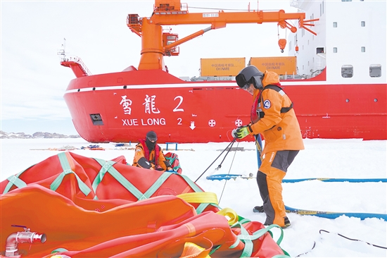 近日,执行中国第42次南极考察任务的“雪龙”号抵达南极中山站外围陆缘冰。“雪龙2”号已于北京时间11月25日率先抵达该区域。两船正协同开展中山站区域大规模卸货作业。本次作业将累计完成约2000吨各类物资卸运。按计划,整体卸货作业将持续约15天。据“雪龙2”号轮机长李文明介绍,“雪龙2”号是首次为考察站补给燃油。 图/新华社