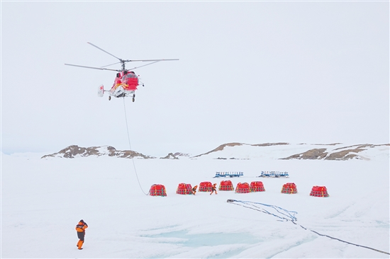 北京时间12月2日傍晚,“雪鹰102”直升机从“雪龙”号甲板飞至“雪龙2”号船侧冰面作业点,开启油囊吊挂作业。 北京时间12月2日傍晚,工作人员在做油囊加注准备工作。
