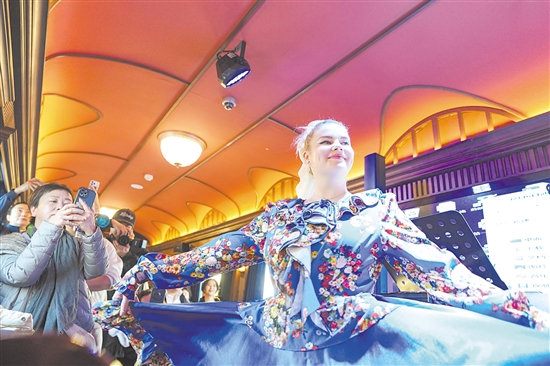 12月6日,“伊春号”冰雪旅游专列投入试运行,40余名受邀体验的游客乘专列由哈尔滨站出发,去往亚布力滑雪旅游度假区。该专列由五大主题车厢组成,有乐队演出与传统民族技艺表演等游客观看与互动环节。