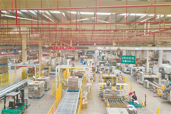 江门秉信包装有限公司今年四季度产量持续攀升,公司各生产线开足马力。图为其自动化生产车间。