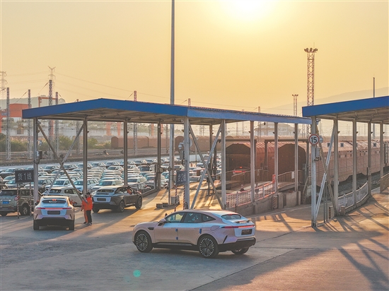 11月29日,在重庆果园港国家物流枢纽铁路货运鱼嘴站商品车物流基地,“重庆造”新能源汽车排队驶入“渝车”专列。新华社发