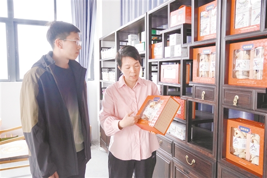 江门农商银行工作人员(左)走访李样讲(广东)陈皮有限公司。
