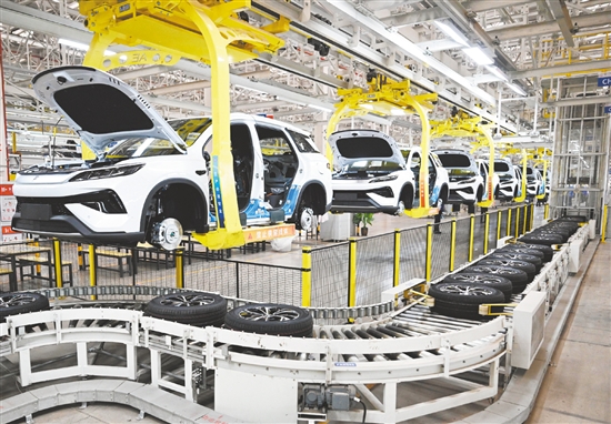 这是2025年11月3日在郑州航空港区比亚迪总装工厂拍摄的新能源汽车“宋Pro”生产线。