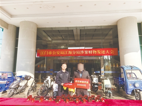 江门日报讯 (文/图 记者/朱磊磊 通讯员/夏凡) 12月16日,江海公安分局举行涉案财物发还大会,发还涉案财物总价值约150万元,为群众挽回了损失,用实际行动彰显了公安机关严厉打击违法犯罪、全力保障人民群众生命财产安全的坚定决心和能力。