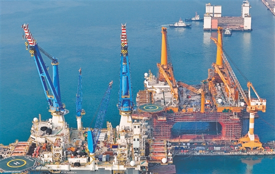 图为12月16日,在中集来福士山东烟台建造基地,多型海工装备在进行建造作业(无人机照片)。