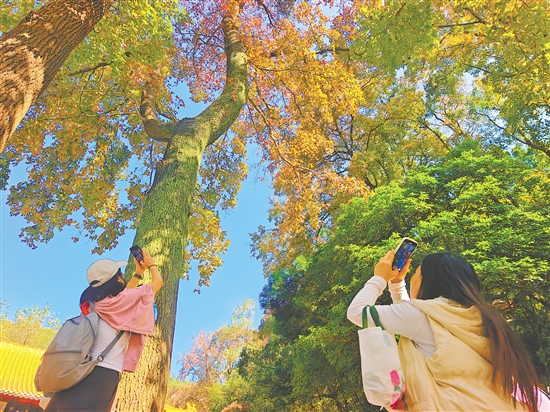 不少市民、游客拿起手机拍下枫叶美景。