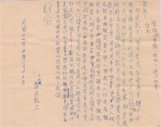 1939年2月,女儿伍盘月在信中哭求学费:“现我姊弟二人仍未有银交学费,今年规定交足半年学费才准入校。爸爸接得我的信,儿(宜)请早日寄银(给)我姊弟入校,以免在家闲游。我已读三四年,倘若无银入学,即是半途而废……千祈接到我信,即寄银。”不久后,儿女的联名信更字字泣血:“请快快寄银(我)姊弟二人读书……家中亦冇钱,饭冇食饱,餸一切没有,你看苦楚吗?你如何不寄银呀?”