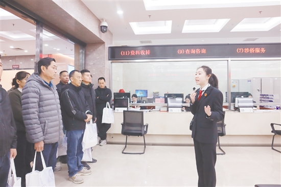 工人们参观诉讼服务中心,了解“一站式”诉讼服务的流程与智慧法院建设成果。