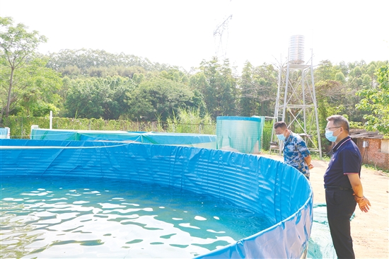 高密度养殖基地建成后,松岗村草鱼养殖实现了自繁自育。图为鹤山市人武部调研组在养殖池旁观察育苗状态。