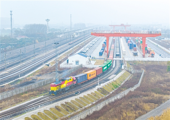 图为3月16日,装载货物的江都至芦潮港海铁联运“天天班”首班专列驶离南京铁路物流中心江都物流基地(无人机照片)。新华社发