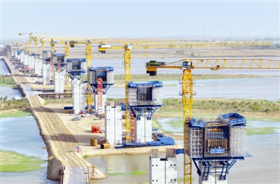 5月8日拍摄的国道110线磴口黄河大桥上部箱梁悬浇施工现场(无人机照片)。 新华社发(王正 摄)