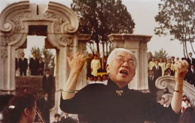 图③1989年8月,在400人大交响乐队伴奏、几百人伴唱下,76岁的骆玉笙高歌《重整河山待后生》