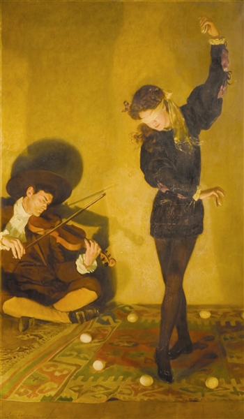 作为德国著名剧作家、诗人歌德花费毕生心血完成的作品,长篇小说《威廉·迈斯特的学习时代》被后世誉为德语“教育小说”的楷模。我国现行人教版高中语文选修教材中,收录了书中的诗篇《迷娘曲》。迷娘是被小说主角威廉·迈斯特解救并收留的卖艺少女,为了表达感激之情,她为威廉表演了一支技艺高超的“鸡蛋舞”。在活跃于19世纪末、20世纪初的英国画家约翰·柯里尔的笔下,还原了这一幕经典场景。