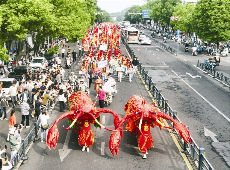 6月12日,以“虾趣狂欢 嗨游全城”为主题的第25届盱眙龙虾节群众文化巡游活动在江苏盱眙街头举行。图为12米长的“龙虾”在巡游队伍中(无人机照片)。 新华社记者 季春鹏 摄