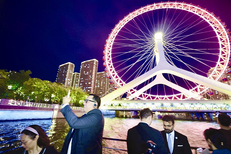 乘坐海河游船,可欣赏两岸旖旎风光,感受天津历史建筑与现代风貌交相辉映,领略中西合璧的独特风情。嘉宾们和桥上、岸边、邻船的快乐人群热情打招呼,各国语言交汇的问候成为此刻与海河水潮中一起飘荡的绝美乐音。“这样的美景是天津独特的魅力和城市活力。”