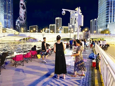 海河是天津的母亲河,也是天津的一张名片。每到夏日,无论是地道的天津人还是来津游客,海河两岸都是休闲游玩的好去处。然而,如今海河亲水平台成了摆摊商家可以随意圈占经营的场所,占地儿的折叠桌椅、太多的鸡尾酒摊让天津这张名片蒙了尘。