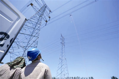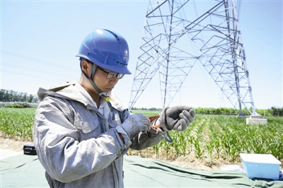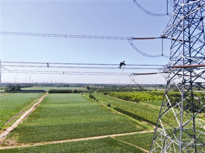 “我们现在已经采用无人机和电动升降装置协助的方式现场作业,相比之前效率提高了很多。”戴着红色安全帽的付明告诉记者。这次出现问题需要紧急处理的500千伏河桥二线的点位周围是一片庄稼,一座座高压电塔矗立在农田之间,一部分已经收割过的农田在烈日下被晒得反光,高压输电线下面是身着整齐电力工作制服的输电工作人员。