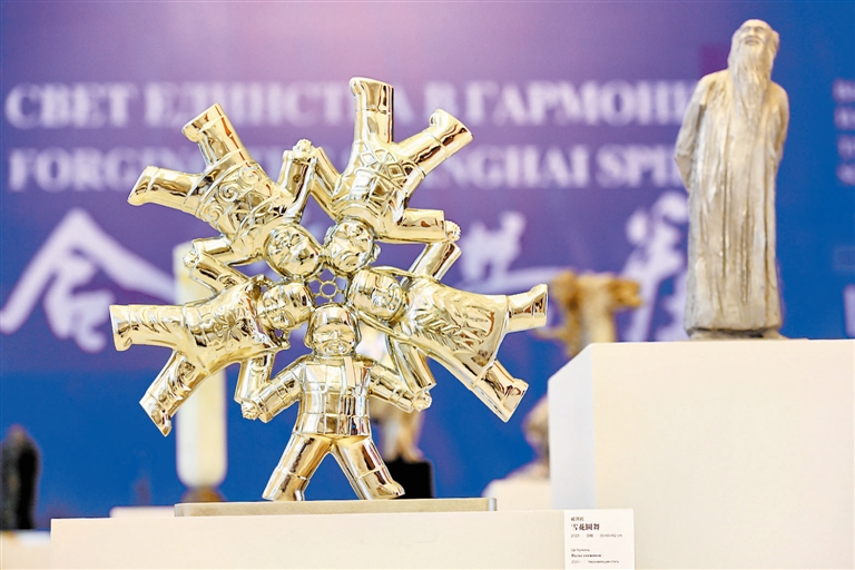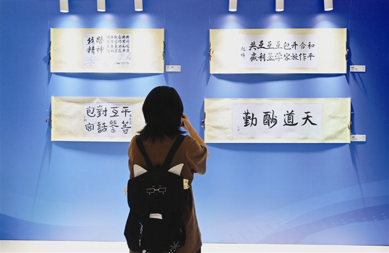①2025上合组织国家文明对话大会会场。②俄罗斯国家杜马国际事务委员会第一副主席、俄罗斯联邦共产党中央委员会副主席德米特里·诺维科夫体验漆扇制作。③“上合组织国家中文书法优秀作品展”。④“合光共塑——上合组织国家雕塑展”。 摄影 记者 胡凌云