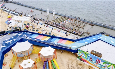 入伏之后,持续高温带动避暑游热潮,东疆海贝公园内游人如织,桨板体验、水上游戏、亲海小火车等项目人气火爆,游客在此体验亲海、观海、赶海的别样乐趣。