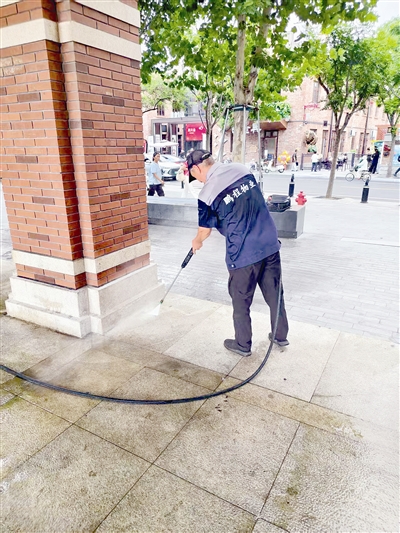 虽然民园广场以及湖南路1920街区是室外步行路,但每日都要严格参照室内清洁标准,对园内石材地面、津足广场、1920街区步行道实施深度清洁。根据席地而坐的标准,道路广场绿地等进行平面深度保洁,在城市客厅主次干道严格执行每天“2洗扫+3冲水”、背街小巷每天“2洗扫+2冲(洒)水”的基础上,推行“吸尘+冲水+洗地”组合式联动作业,每月不少于1次全面积深度清洗;非机动车道和人行道每天不少于3次冲洗作业。园路、汀步、台阶等硬质铺装实行每天“2清扫+1精洗”。