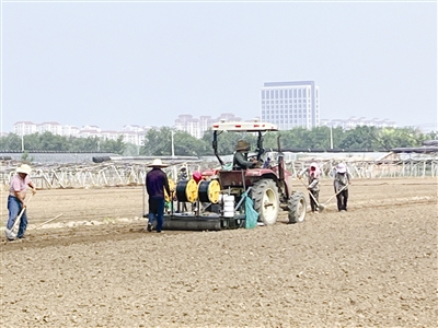 立秋前后的这段时间,西青区辛口镇小沙窝村的郭振芝正带领一家人在田地里忙活,除了自家的田地外,他还流转了不少农田,今年种植沙窝萝卜的田地达到了200亩。郭振芝的田地距离公路不远,凌晨5点,远远望去就能看见十几人在忙碌。一台播种机器正沿着提前测量好的路线,将萝卜种子种到地里。这台机器一次能播下6行种子,同时还能铺设3条滴灌带,种子进入土层后随即开始浇灌。走近播种机才发现,萝卜种子已经提前缠到了纸条中,通过机器只能看到一条条白色的纸条被埋进了土里。