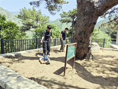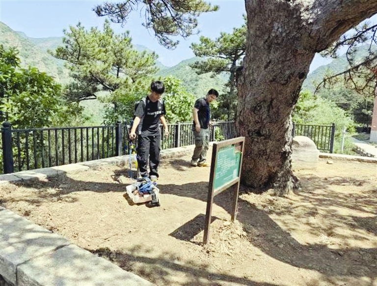 历经千百年的古树名木由于环境变迁、人为干预、自然灾害影响、病虫害侵蚀等原因,常常会出现主干中空、枝条生病甚至死亡等情况,此次“体检”采取“一树一档”的精细化检测模式,运用先进监测设备对古树根系、树干、树冠和土壤生境等进行科学监测诊断,全面掌握古树健康状况。根系层检测中,运用树木雷达根系检测系统,根据回声波段分析树根生长态势,采集的数据被带回实验室详细分析。树干层检测中,检查树体腐朽、主干倾斜或劈裂等情况,使用弹性波树木断层画像诊断仪“透视”木质部,像做“CT”一样定位内部空洞、腐朽区域,无损检测内部健康状况。树冠层检测中,判定需清除的枯枝、死杈和病虫害严重的枝条,对古树叶片的叶绿素含量检测,进一步评估叶片健康度。地面土壤检测中,重点关注是否存在建筑挤压、地面硬化铺装、污水排放、垃圾堆积等不利因素,对长势衰弱的古树进行土壤取样分析,精准测定pH值、有机质和氮磷钾含量等指标,分析土壤理化性质,为古树日常养护提供科学依据。