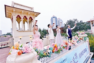下午,游人如织的意风区内,天津歌舞剧院的多位演员现身马可波罗广场西北角楼楼顶,意大利经典声乐作品音乐会精彩开场,从威尔第到普契尼,再到多尼采蒂的歌剧经典在意风区上空唱响。悠扬的歌声慢慢聚拢人群,大家纷纷举起相机,记录下一段段美妙旋律。“这些歌太熟悉了,在意风区演唱,太合适了!”来自山东的游客李威表示。