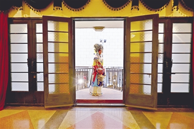 在京剧伴奏声中,14岁的“杨贵妃”现身戏院二楼阳台,“丽质天生难自捐,承欢侍宴酒为年。六宫粉黛三千众,三千宠爱一身专。”婉转含情的韵白吸引过往人群驻足拍摄。她转身走进室内“共舞台”且唱且舞,引领观众进入月色之中。行至一楼梅兰芳先生塑像前,“杨贵妃”蹲身嗅花再下蹲“卧鱼”,醉态之美让百余位观众鼓掌叫好。