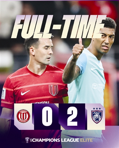 本报讯(记者 申炜)本赛季紧张刺激的争冠大战,成为中超最具吸引力的看点,不过这也影响了中超球队在亚冠的比赛成绩。昨天,在亚冠精英联赛第三轮比赛中,做出大面积轮换的成都蓉城队和上海海港队,以0比2的相同比分不敌马来西亚柔佛新山队和日本町田泽维亚队。