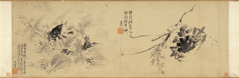 明代著名文学家、书画家徐渭虽有着卓越的才华,却毕生经历坎坷,怀才不遇,甚至一度陷入疯狂。壅塞胸中的不平之气,在他的笔下挥洒而出,凝结成泼墨淋漓的画作。《蟹鱼图》便是其中之一。画中的主角虽仅一蟹、一鱼,微不足道,却笔致纵横,气势恣肆。