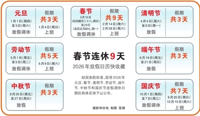 经国务院批准,现将2026年元旦、春节、清明节、劳动节、端午节、中秋节和国庆节放假调休日期的具体安排予以公布。